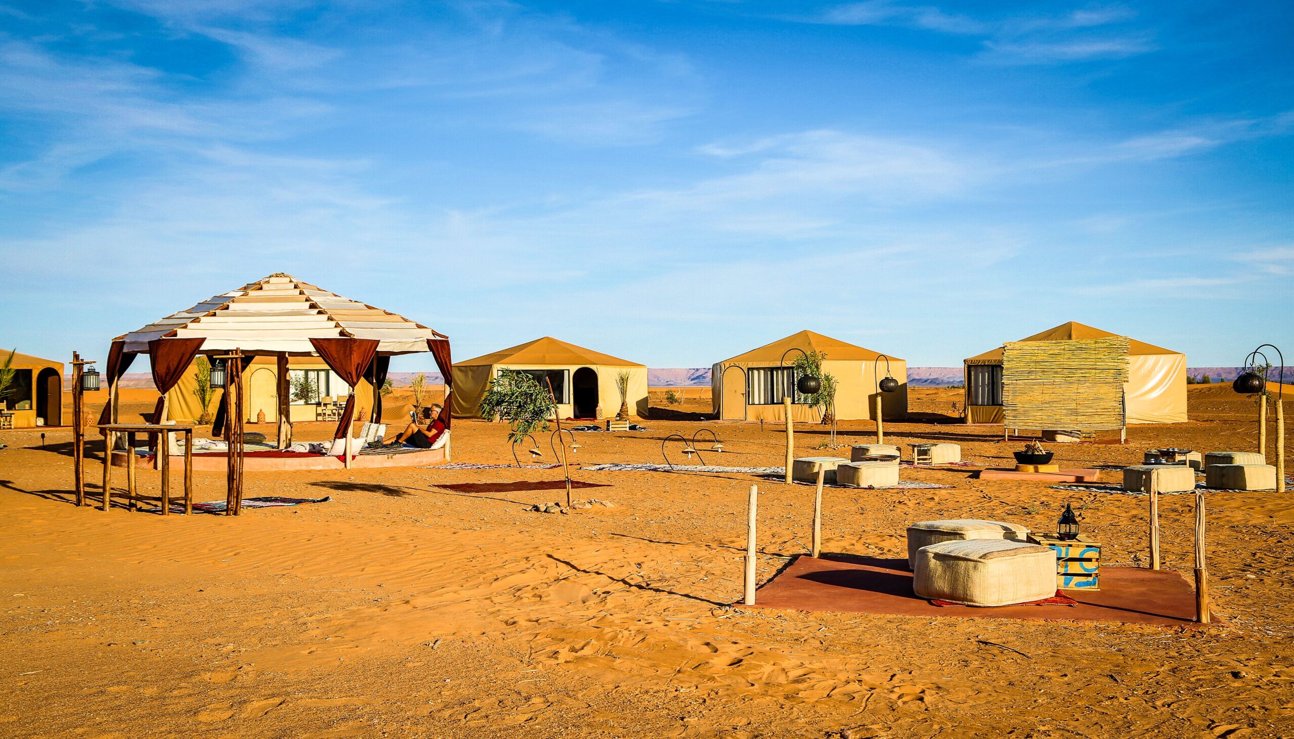 Por la tarde llegaremos al desierto del Sáhara, en Merzouga. Allí cambiaremos a camellos y cruzaremos el desierto arenoso. Haremos una parada para que disfrutes de la mágica puesta de sol desde lo alto de una duna. A continuación, continuaremos hacia el lujoso campamento del desierto. Allí podrás disfrutar de la música de los tambores bereberes mientras bailas alrededor de la hoguera, bajo el vasto cielo estrellado. Cena y alojamiento en el campamento.